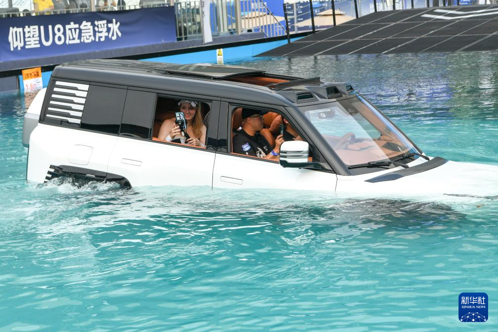 8月30日,在第二十七屆成都國際汽車展覽會室外汽車技術(shù)展示區(qū),參觀者在仰望U8應急浮水測試中拍攝。