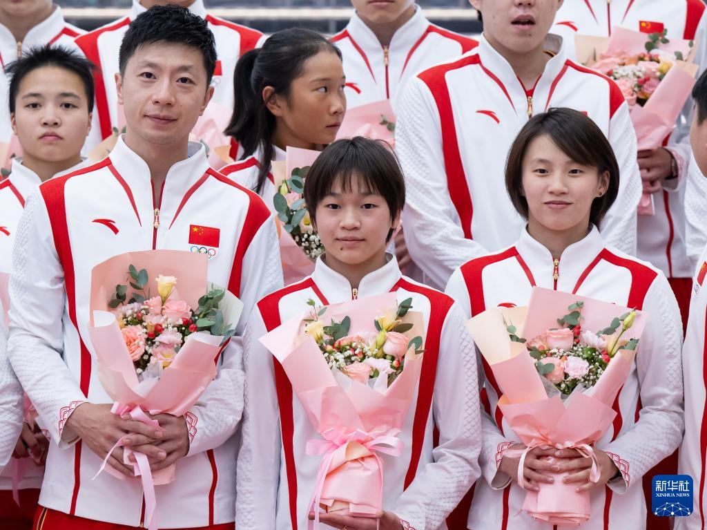 8月31日,乒乓球運動員馬龍(前左)、跳水運動員全紅嬋(前中)、陳芋汐(前右)在歡迎儀式上。