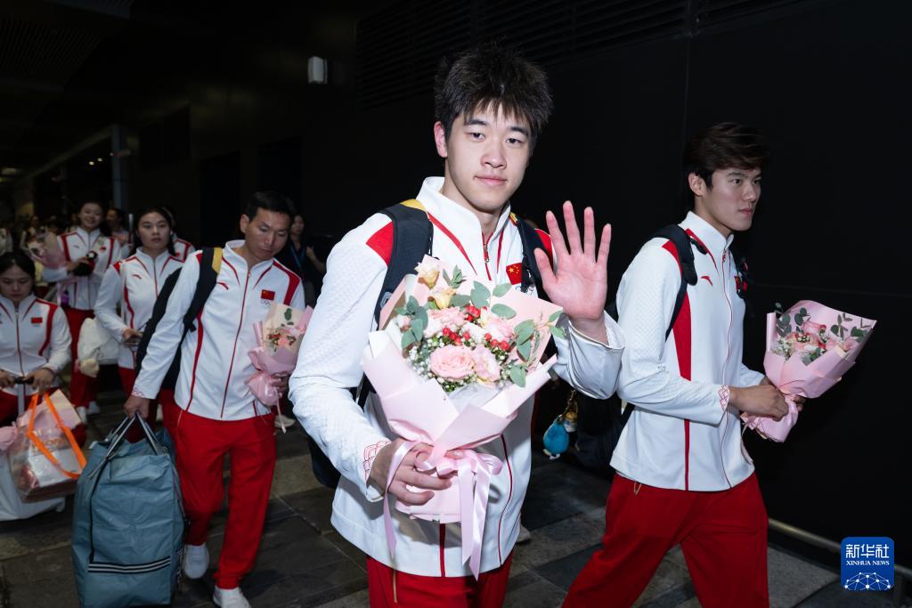 8月31日,游泳運動員潘展樂(前)在歡迎儀式上。