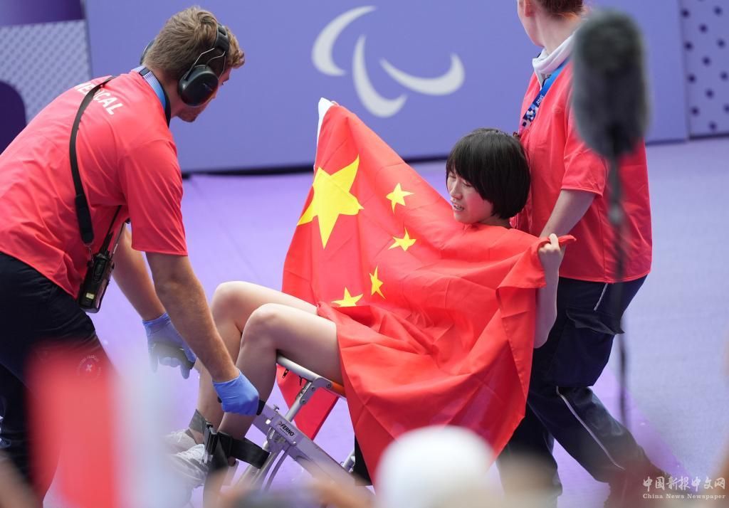 史逸婷在女子200米T36級(jí)決賽中拼到雙腿力竭,打破殘奧會(huì)紀(jì)錄奪冠。被攙上椅子后,她努力張開五星紅旗向全場(chǎng)展示。