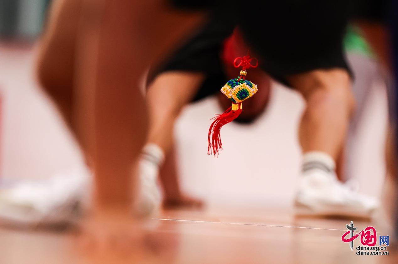 11月25日,第十二屆全國(guó)少數(shù)民族傳統(tǒng)體育運(yùn)動(dòng)會(huì)押加項(xiàng)目比賽在海南熱帶海洋學(xué)院體育館進(jìn)行,圖為選手比賽中的墜條,裁判通過(guò)墜條的移動(dòng)位置判定勝負(fù)。中國(guó)網(wǎng)記者 董寧 攝影