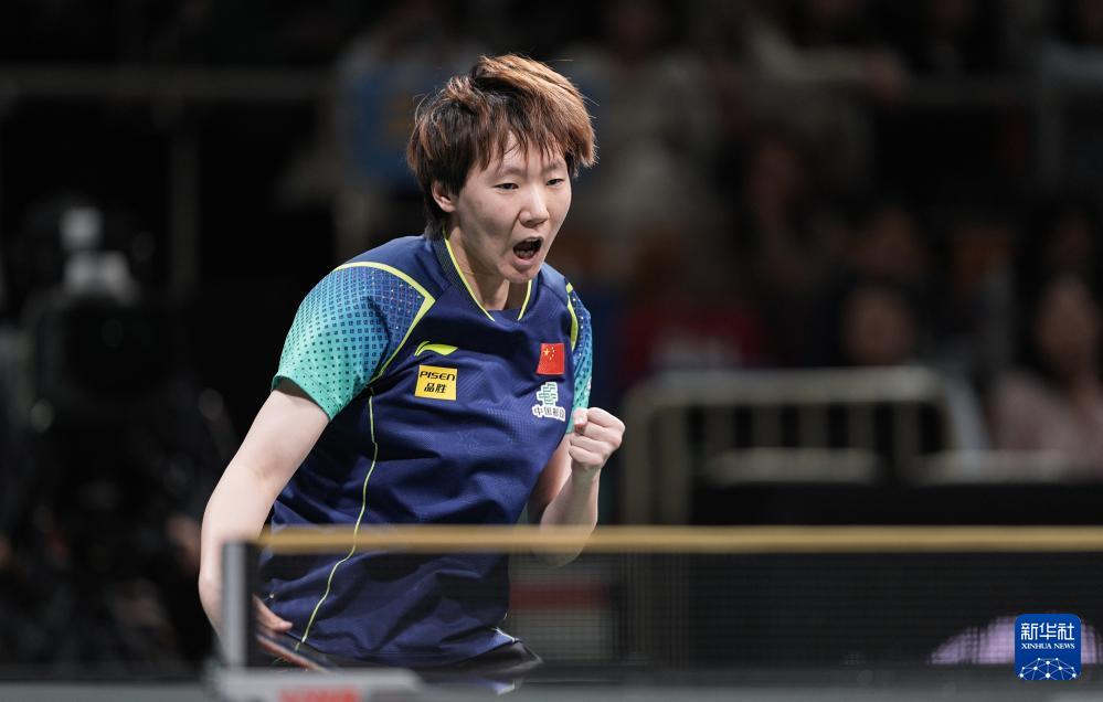 12月8日,中國隊選手王曼昱在女單比賽中慶祝得分。最終,她3比0勝羅馬尼亞隊選手阿迪娜·迪亞科努。