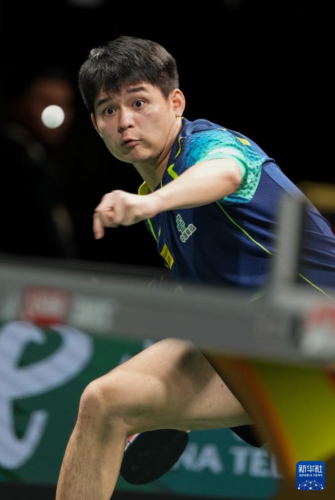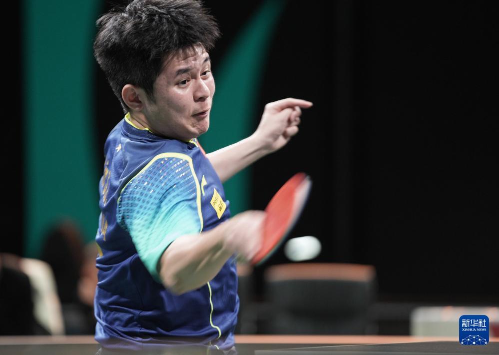 12月8日,中國隊選手林詩棟在男單比賽中回球。最終,他3比0勝羅馬尼亞隊選手愛德華·約內(nèi)斯庫。