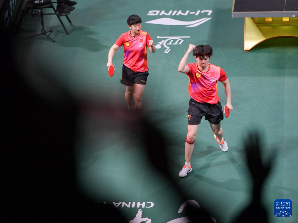 12月8日,中國隊(duì)組合王楚欽(右)/孫穎莎在混雙比賽中慶祝得分。最終,他們2比1戰(zhàn)勝韓國隊(duì)組合趙大成/申裕斌。
