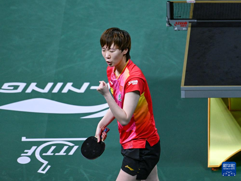 12月8日,中國隊(duì)選手王曼昱在女單比賽中慶祝得分。最終,她3比0戰(zhàn)勝韓國隊(duì)選手金娜英。