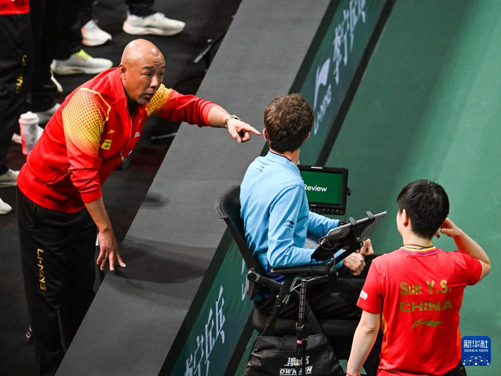 12月8日,中國隊(duì)教練肖戰(zhàn)(左)在比賽中和裁判溝通。