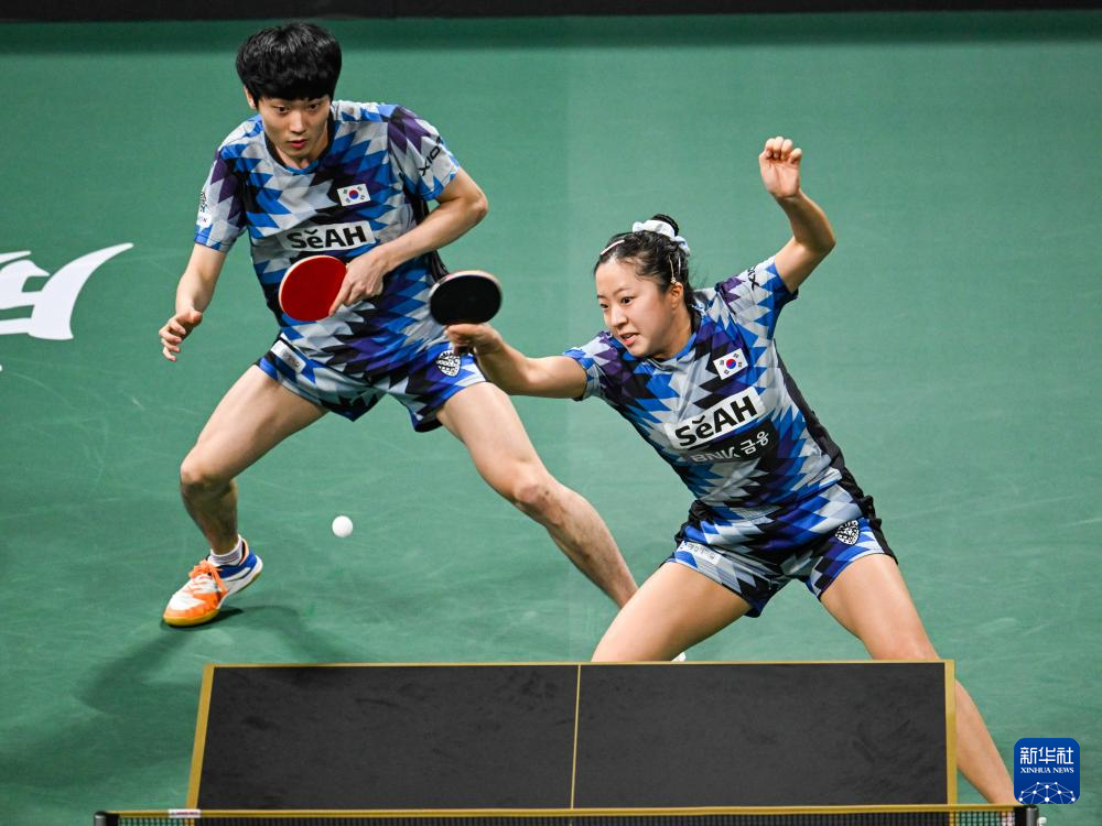 12月8日,韓國隊(duì)組合趙大成/申裕斌(右)在混雙比賽中。最終,他們1比2負(fù)于中國隊(duì)組合王楚欽/孫穎莎。