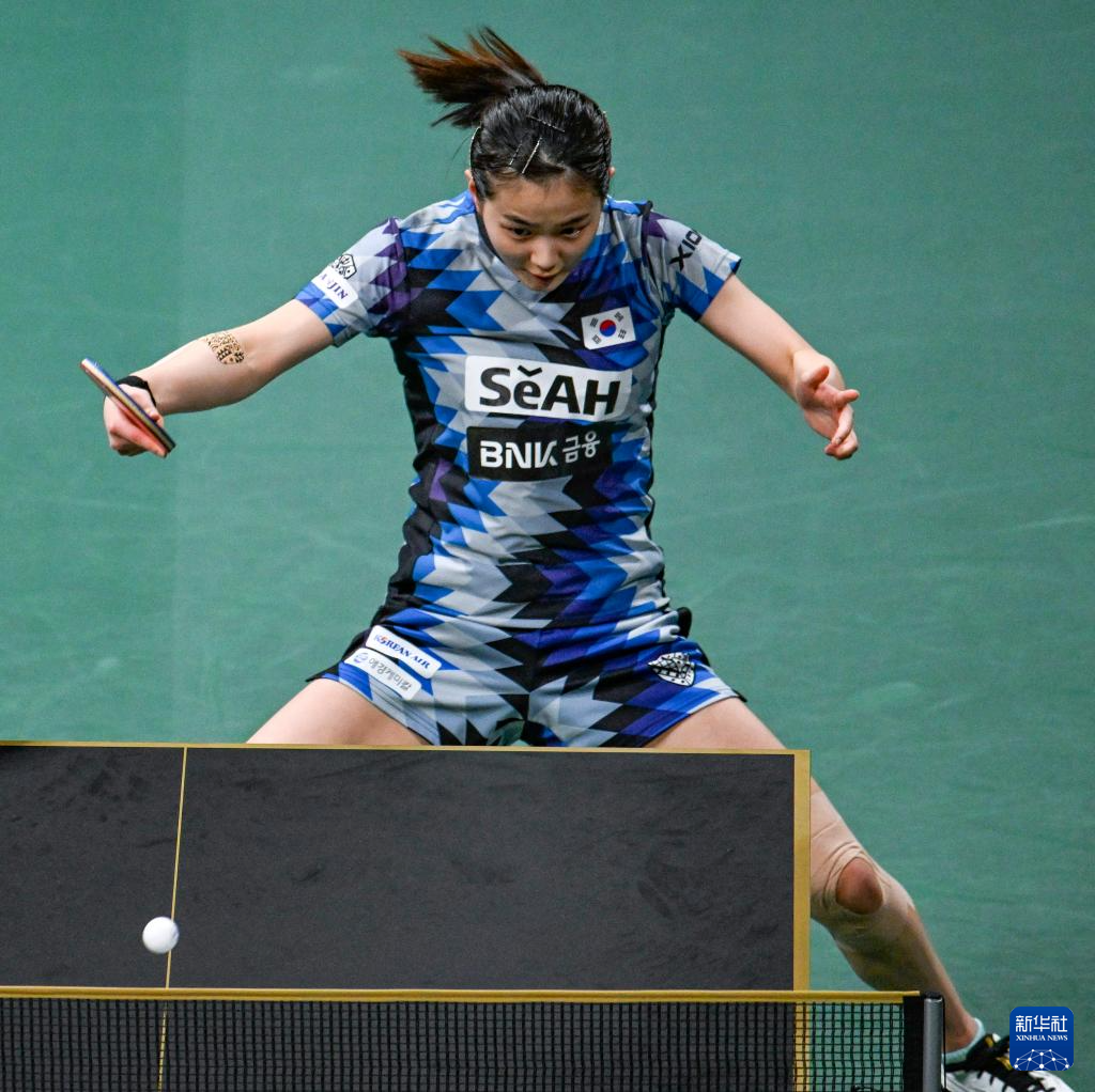 12月8日,韓國隊(duì)選手金娜英在女單比賽中。最終,她0比3負(fù)于中國隊(duì)選手王曼昱。