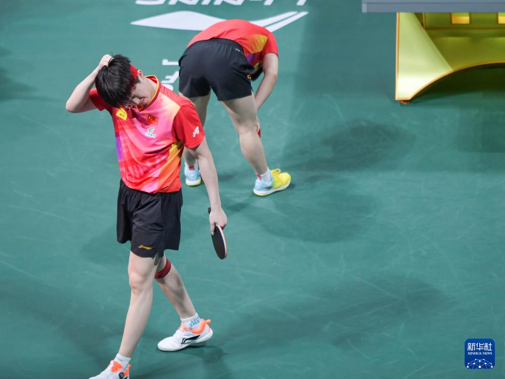 12月8日,中國隊(duì)組合王楚欽(左)/孫穎莎在混雙比賽中。最終,他們2比1戰(zhàn)勝韓國隊(duì)組合趙大成/申裕斌。