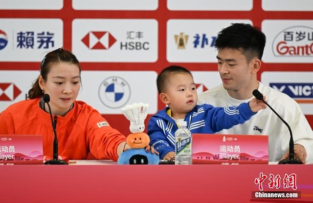 12月15日,2024世界羽聯(lián)世界巡回賽總決賽在浙江杭州舉行,中國組合鄭思維(右一)/黃雅瓊(左一)在混雙決賽中2比1戰(zhàn)勝馬來西亞組合陳堂杰/杜頤溈,奪得本項(xiàng)目冠軍。圖為鄭思維帶孩子參加新聞發(fā)布會。中新社記者 王剛 攝