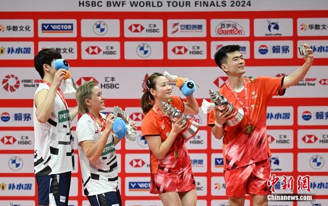 12月15日,2024世界羽聯(lián)世界巡回賽總決賽在浙江杭州舉行,中國組合鄭思維(右)/黃雅瓊(左)在混雙決賽中2比1戰(zhàn)勝馬來西亞組合陳堂杰/杜頤溈,奪得本項(xiàng)目冠軍。中新社記者 王剛 攝