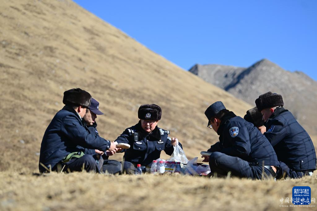 1月9日,大通回族土族自治縣公安局北川河源區(qū)國(guó)家級(jí)自然保護(hù)區(qū)生態(tài)警務(wù)室民警和輔警在巡邏途中吃午飯。新華社記者 張龍 攝