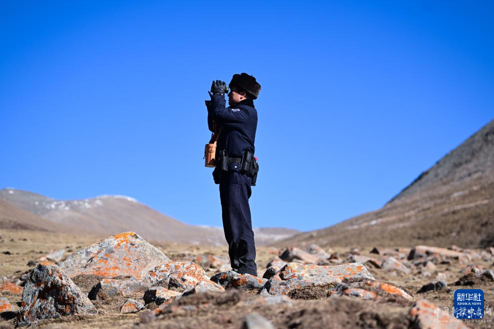 1月9日,大通回族土族自治縣公安局北川河源區(qū)國(guó)家級(jí)自然保護(hù)區(qū)生態(tài)警務(wù)室輔警董金全用望遠(yuǎn)鏡查看周邊環(huán)境。新華社記者 張龍 攝
