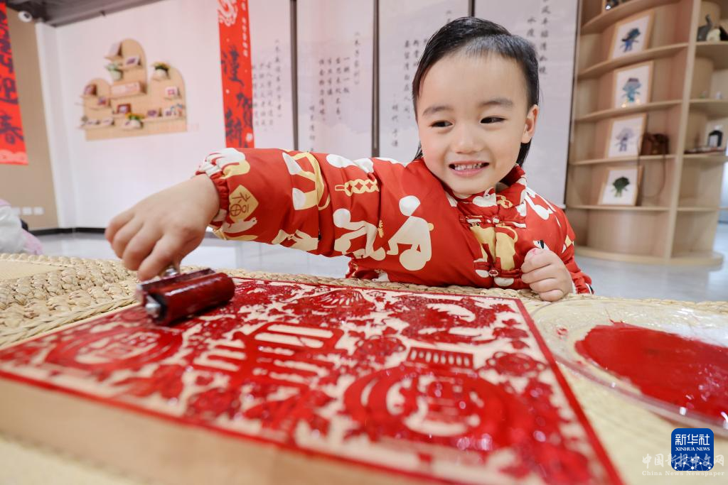 1月13日,在浙江省湖州市德清縣舞陽街道上柏村柏閱書房,小朋友在非遺迎新春活動中體驗傳統(tǒng)木版年畫拓印技藝。
