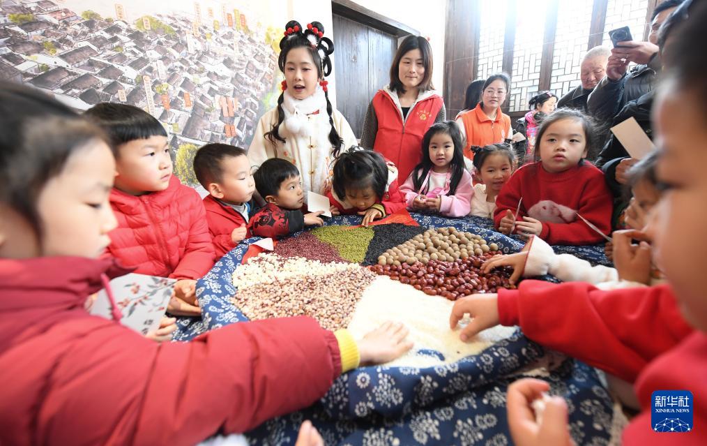 1月13日,湖州市實驗幼兒園的老師帶著學生在小西街的民俗展示廳認識臘八粥的原料。