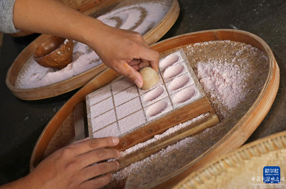 楊勤峰用糕粉填滿模具,以雞蛋形工具壓下開窩(1月10日攝)。