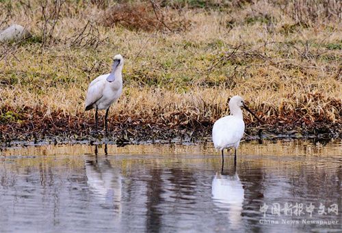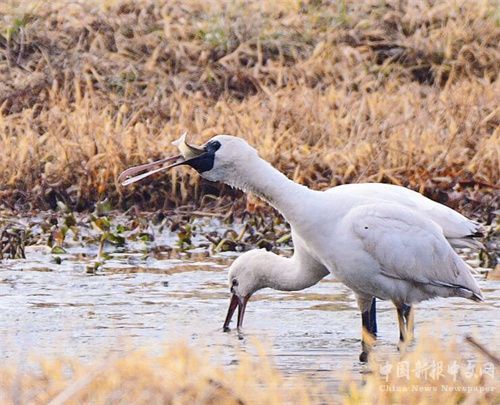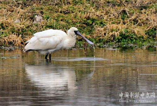“我是從微信群里得知富山橋下來了一只黑臉琵鷺。我趕過去拍時,它和一只白琵鷺正跟隨一群白鷺在水里覓食。”攝影愛好者葉政紅介紹,自己拍鳥已有5年,之前只拍到過五六只白琵鷺,今年能遇到黑臉琵鷺實屬難得。