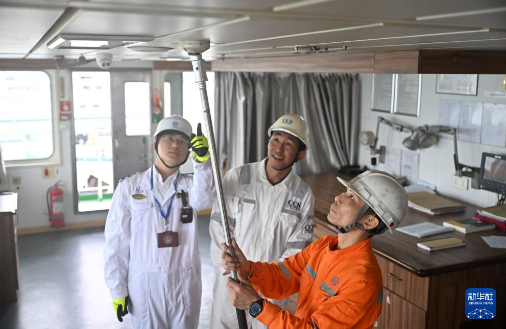 1月22日,安檢員在??谛潞8蹤z查客滾船煙感探測器。