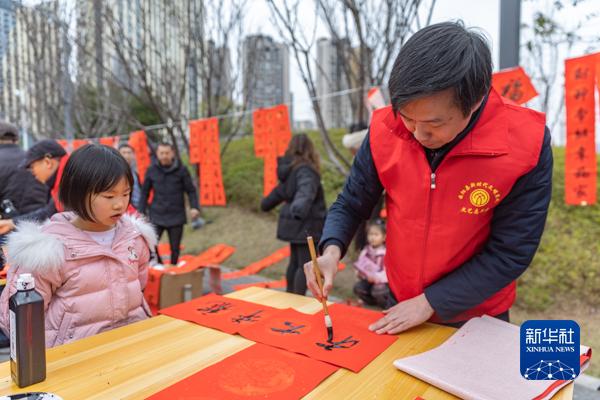 1月22日,在重慶市云陽縣舉辦的2024年民俗展演暨非遺傳承技藝展示活動現(xiàn)場,書法愛好者為市民書寫春聯(lián)。