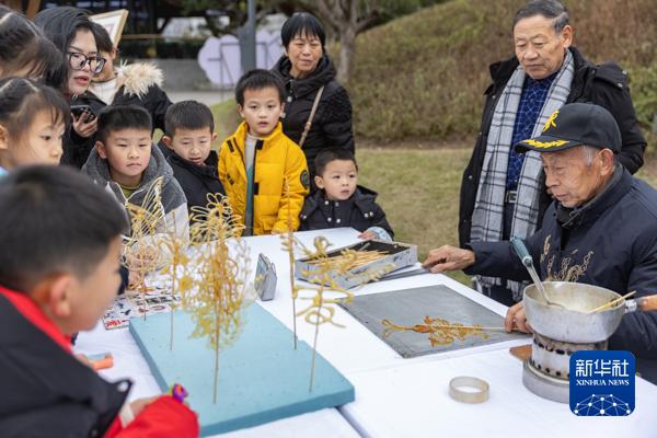 1月22日,在重慶市云陽縣舉辦的2024年民俗展演暨非遺傳承技藝展示活動現(xiàn)場,小朋友在觀看非遺糖畫制作。