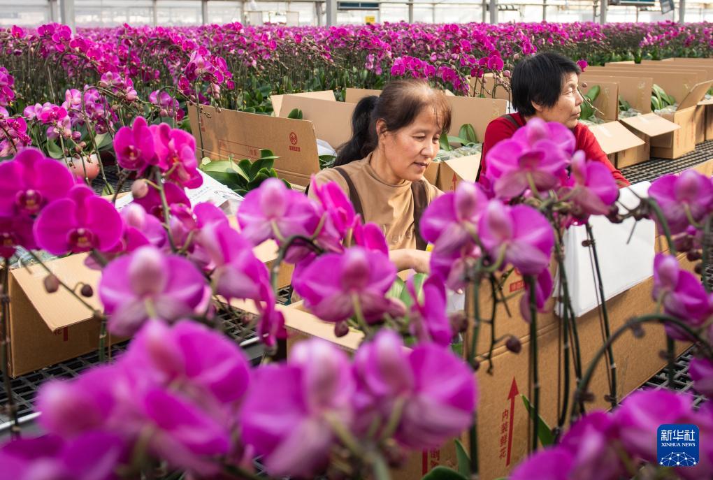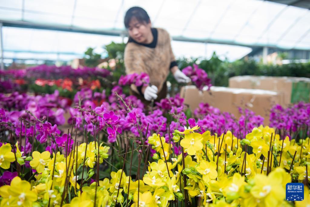 1月23日,在寧夏銀川市興慶區(qū)玉松旺蝴蝶蘭生產(chǎn)基地,工作人員打包花卉。歲末時節(jié),年宵花卉迎來銷售旺季。