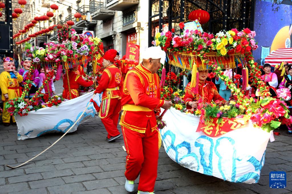 1月28日,民間藝人在江蘇省連云港市連云區(qū)老街表演劃旱船。
