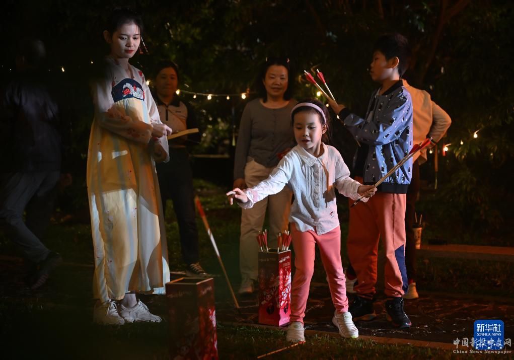 1月31日,游客在海南省博物館體驗(yàn)投壺游戲。