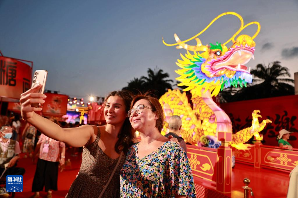 2月5日晚,在海南三亞大東海廣場(chǎng)舉行的新春游園會(huì)上,游客和10米巨龍花燈自拍留影。