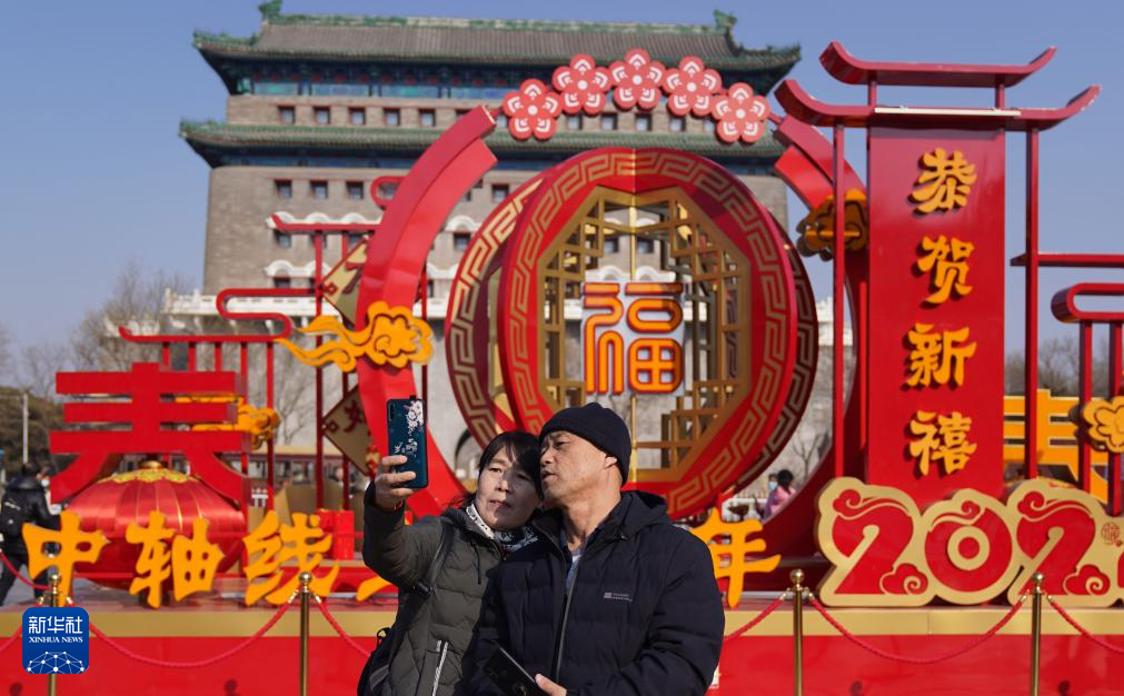 2月5日,游客在北京前門大街自拍留念。