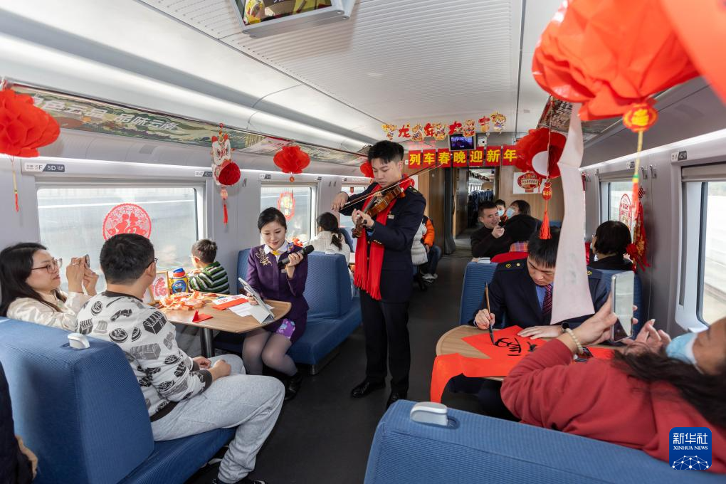 2月9日,在鐵路上??瓦\段G1426次列車舉行的“列車春晚迎新年”主題活動上,乘務(wù)員為旅客演奏小提琴。