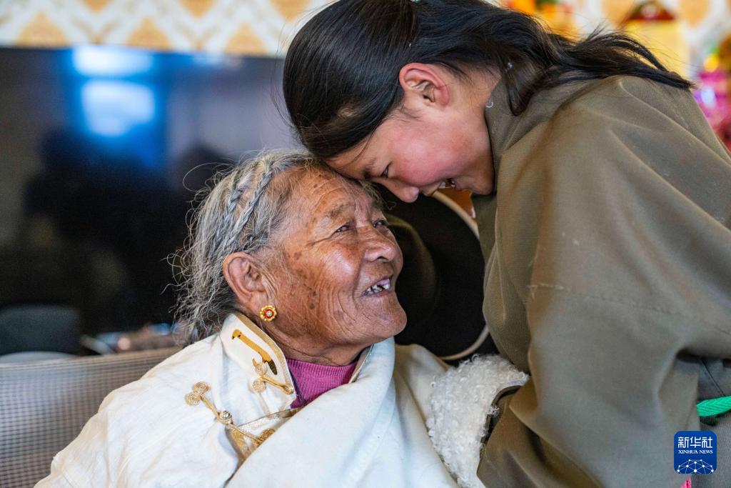 大年初一,斯曲旺姆的兒女們帶著各自的小家庭來團聚,百余人的大家庭有幾十人回來過年。坐在溫暖的家中,斯曲旺姆的孩子們依次獻上哈達、敬上青稞酒,被圍坐在中間的她希望“這樣的日子能久一點,再久一點……”