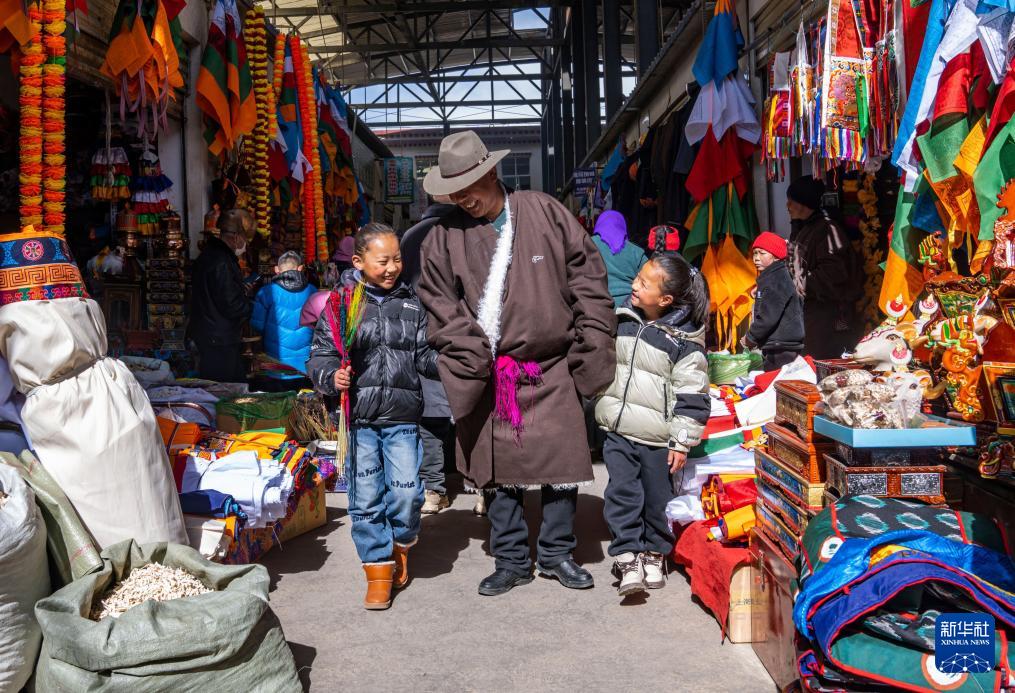 索朗羅達和孫女們在當(dāng)雄縣的年貨市場買年貨(2月3日攝)。