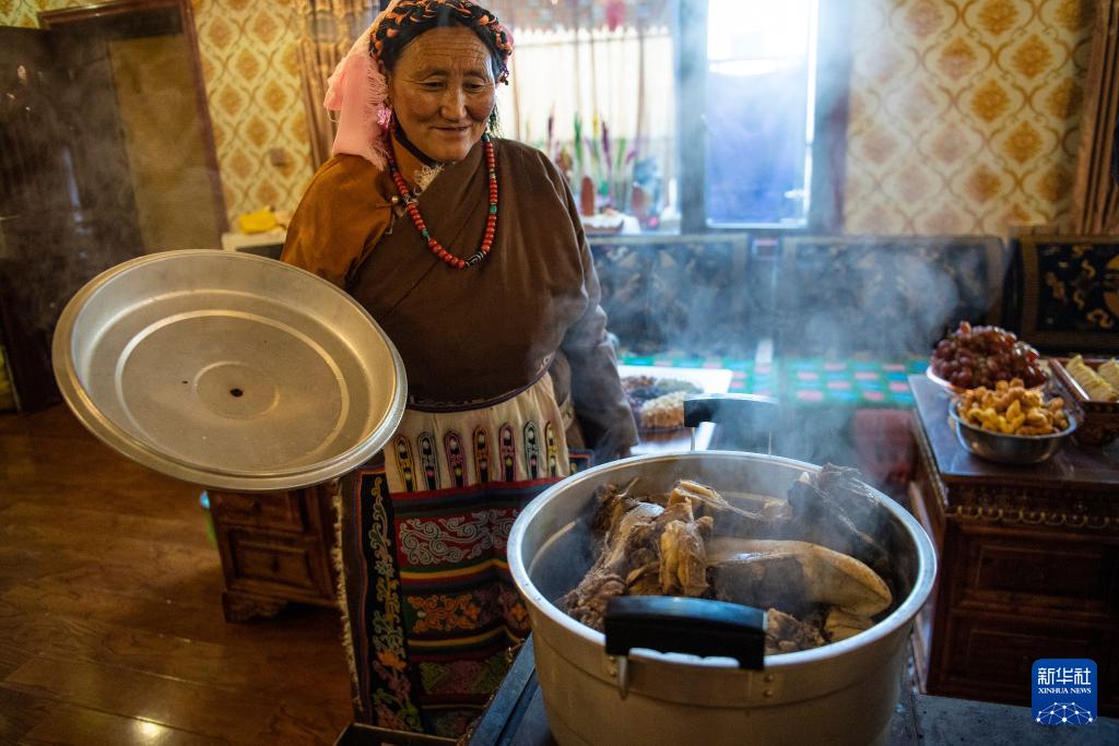 2月10日,斯曲旺姆的兒媳婦朗果在為家人煮牦牛肉。