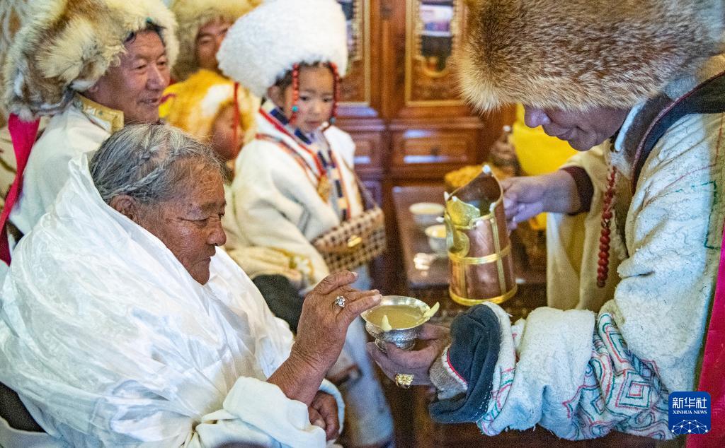 2月10日,斯曲旺姆的兒子索朗羅達(右)為母親敬上青稞酒。
