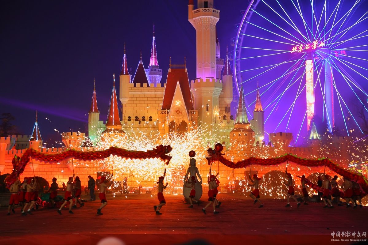 2月13日晚,在北京石景山游樂園迎春廟會上,精彩的打鐵花舞龍表演增加了節(jié)日的喜慶氣氛。中國日報(bào)記者 姜東 攝