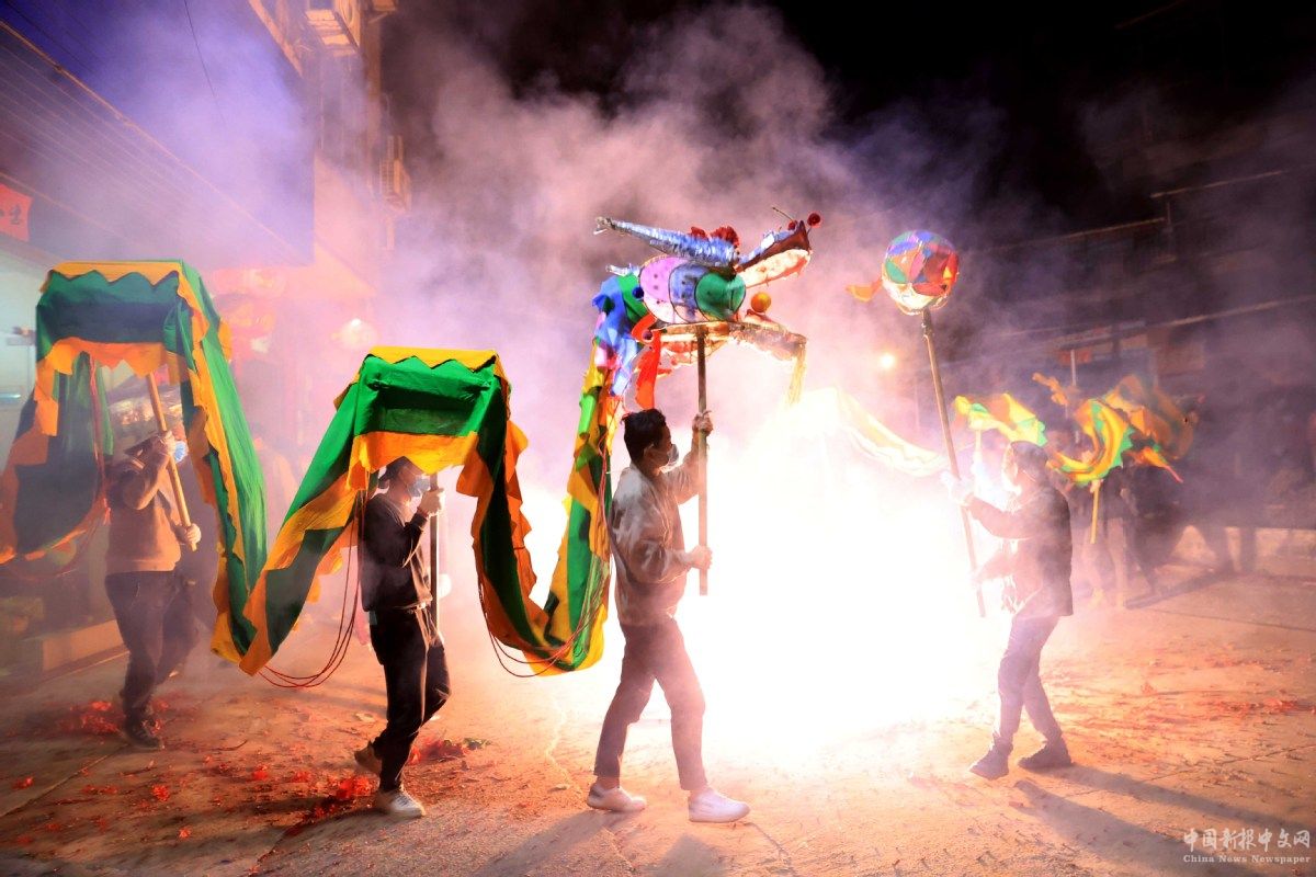 2月12日晚,在廣西柳州市融安縣浮石鎮(zhèn),人們舞動炮龍,慶祝新春佳節(jié)。譚克興 攝