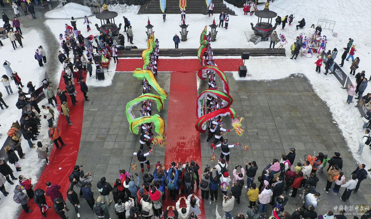 2月12日,在湖南省張家界天門山景區(qū),游客觀賞舞龍表演。邵穎 攝