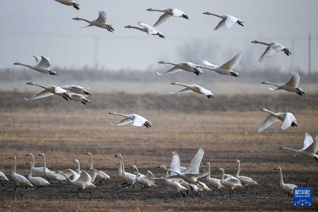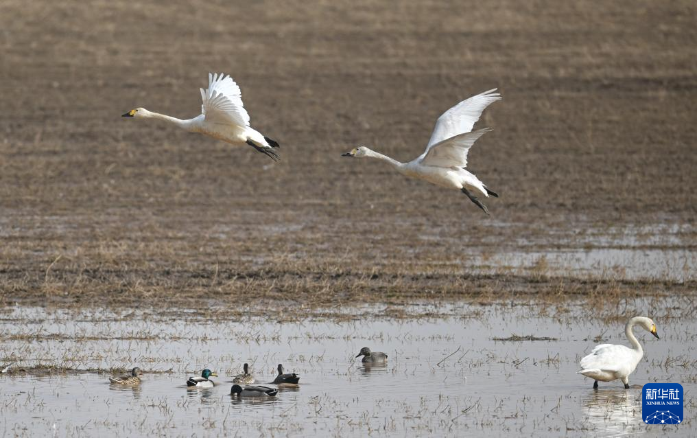 3月16日,在呼和浩特市托克托縣黃河濕地,天鵝在空中飛翔。