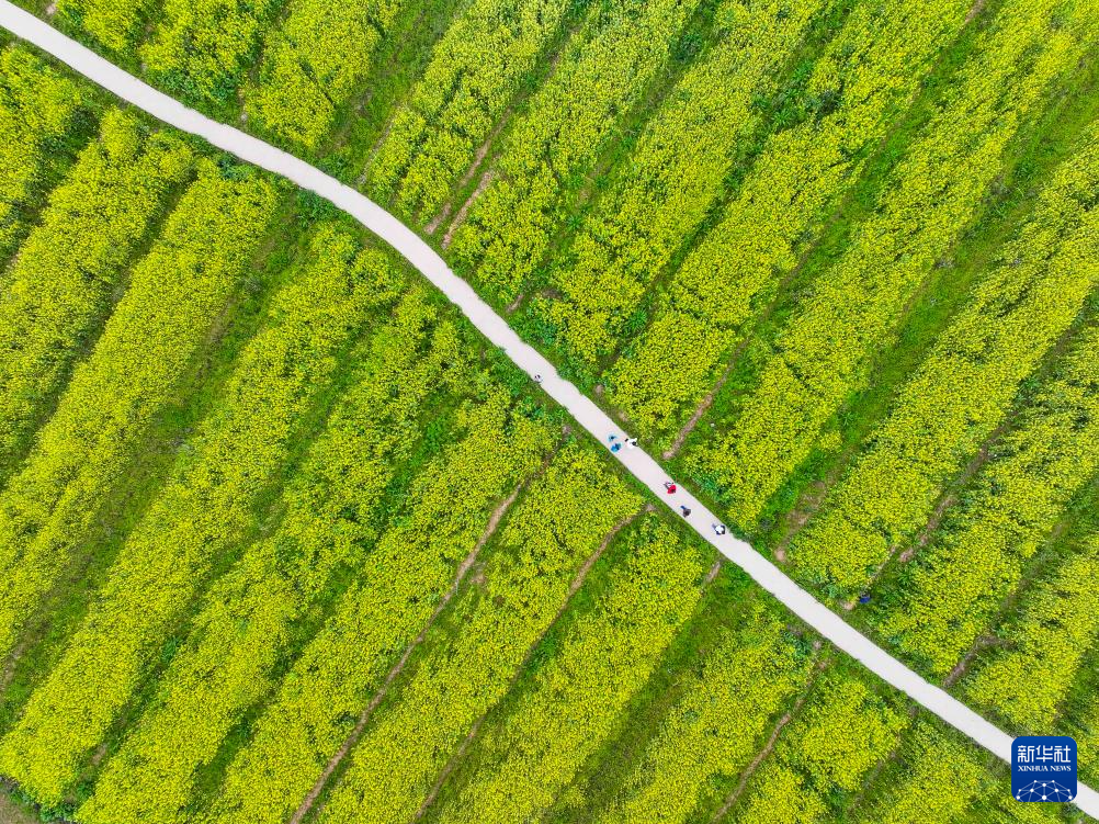 3月16日,游客在重慶廣陽島油菜花田游覽(無人機照片)。新華社記者 王全超 攝
