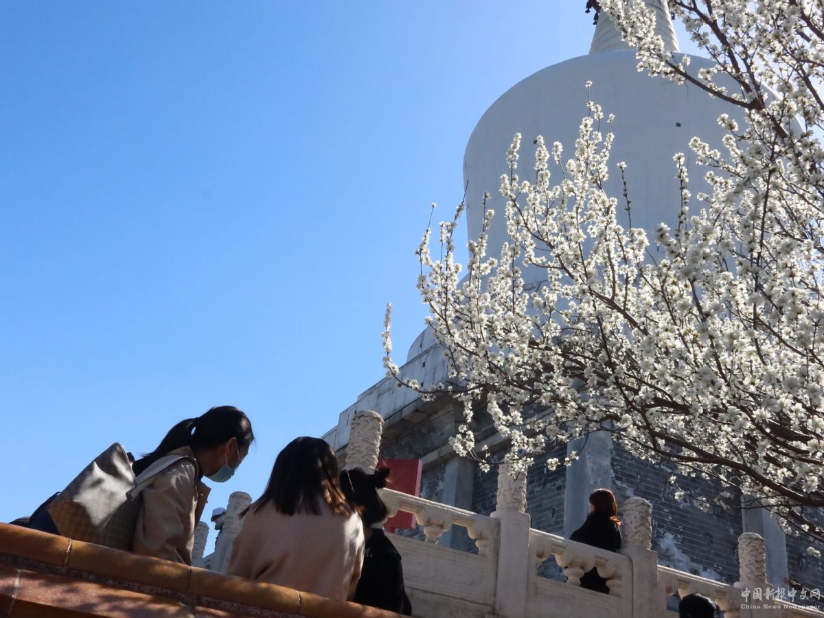 3月20日,北海公園,盛開的山桃花與白塔相映成趣。中國日報記者 姜東 攝