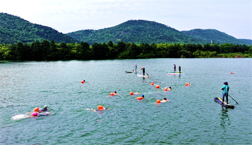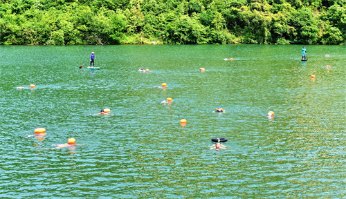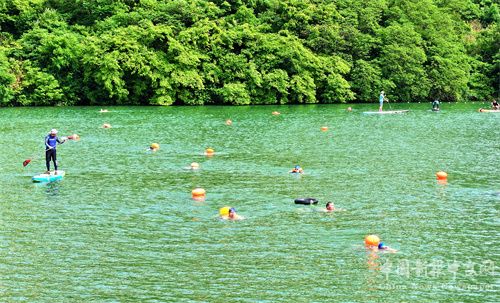 2024年5月1日,“五一”國際勞動(dòng)節(jié),安徽省合肥市廬江縣游泳協(xié)會(huì)的數(shù)十名游泳健兒在縣城附近的夾山硔水庫勇戰(zhàn)低水溫,劈波斬浪,為勞動(dòng)者送上“五一”節(jié)祝福。 (巢志斌 攝)