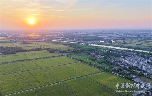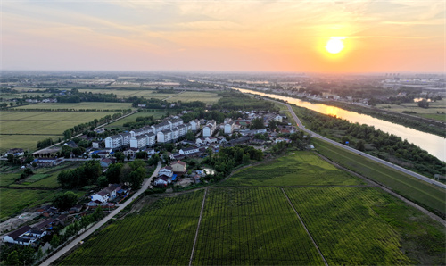 2024年5月8日,安徽省合肥市廬江縣郭河鎮(zhèn)廣寒村,田野里正逐漸轉(zhuǎn)黃的小麥、夕陽映照的杭埠河、阡陌田塍與白墻紅瓦的農(nóng)舍交相輝映,錯落有致,在豐沃的大地上繪出一幅初夏美麗的鄉(xiāng)村風(fēng)光圖。 (巢志斌 攝)