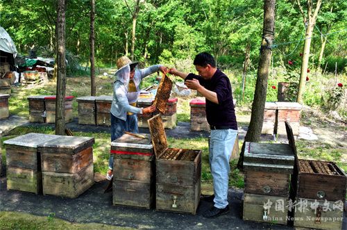 張達(dá)勝夫妻倆養(yǎng)蜂已有30多年歷史,如今擁有300多箱蜜蜂,在生產(chǎn)蜂蜜、蜂王漿的同時,還開展了蜜蜂為果園授粉業(yè)務(wù),每年為果農(nóng)的草莓、西瓜、藍(lán)莓、桃樹等果園授粉達(dá)1000多畝,果園提高了產(chǎn)量,自己也獲得了一定的收益。 (巢志斌 攝)