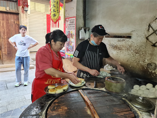 2024年5月18日,在安徽省首批“千年古村落”合肥市廬江縣龍橋鎮(zhèn)黃屯老街,游客正在購買當(dāng)?shù)靥厣朗?、知名非遺早點(diǎn)小吃產(chǎn)品朱永坤大米餅。