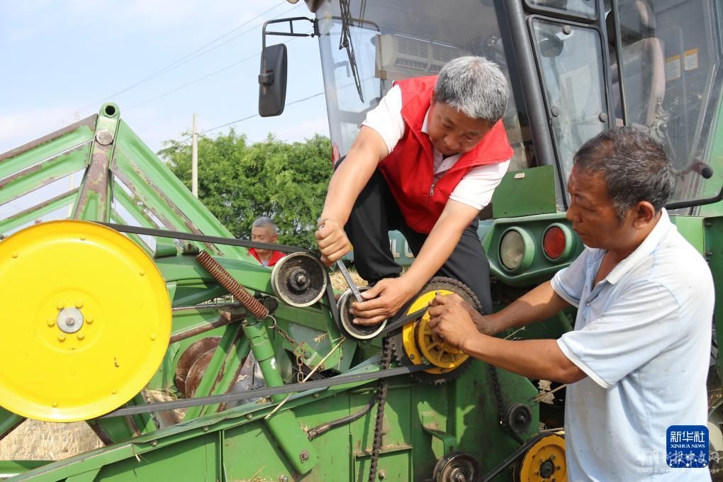 5月26日,在河南省南陽市內(nèi)鄉(xiāng)縣大橋鄉(xiāng),農(nóng)機(jī)服務(wù)人員(右二)為跨區(qū)作業(yè)的農(nóng)機(jī)手提供免費(fèi)機(jī)修服務(wù)。