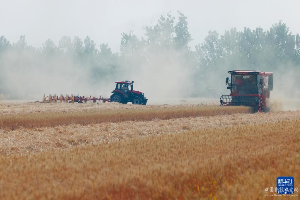 5月25日,在河南省駐馬店市汝南縣三橋鎮(zhèn)殷店村,收割機(jī)、秸稈摟草機(jī)在麥地里穿梭作業(yè)。