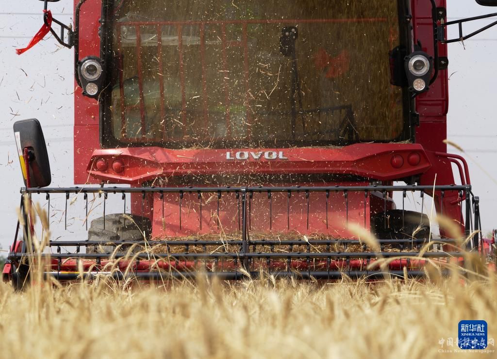 5月26日,在河南省商丘市睢縣尚屯鎮(zhèn)荒莊村,農(nóng)民駕駛收割機(jī)搶收小麥。