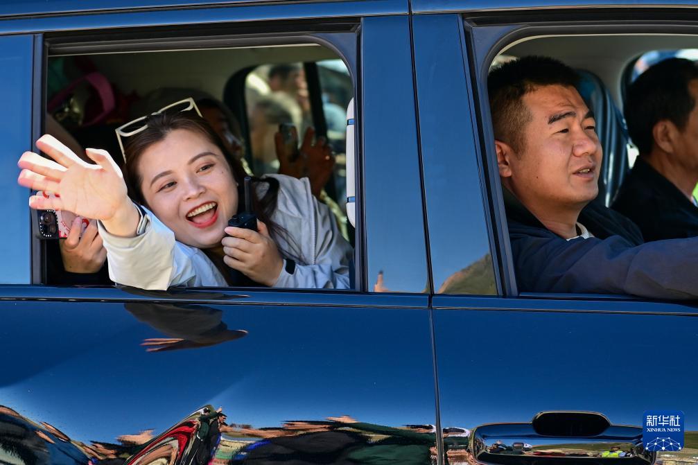 6月1日,在新疆塔城地區(qū)烏蘇市獨(dú)庫(kù)公路驛站,游客在車上向當(dāng)?shù)厝罕姄]手致意。