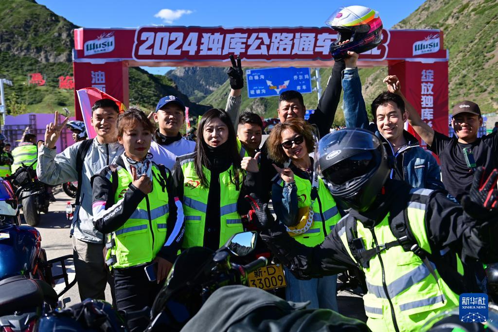 6月1日,在新疆塔城地區(qū)烏蘇市獨(dú)庫(kù)公路驛站,摩托車手在通車儀式前合影留念。