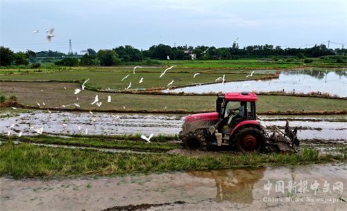 2024年6月18日,安徽省合肥市廬江縣柯坦鎮(zhèn)陳埠社區(qū),一位村民正駕駛旋耕機翻耕農田,百余只鶴鳥圍繞機械追逐覓食,勾勒出一派和諧的生態(tài)田園風光圖。